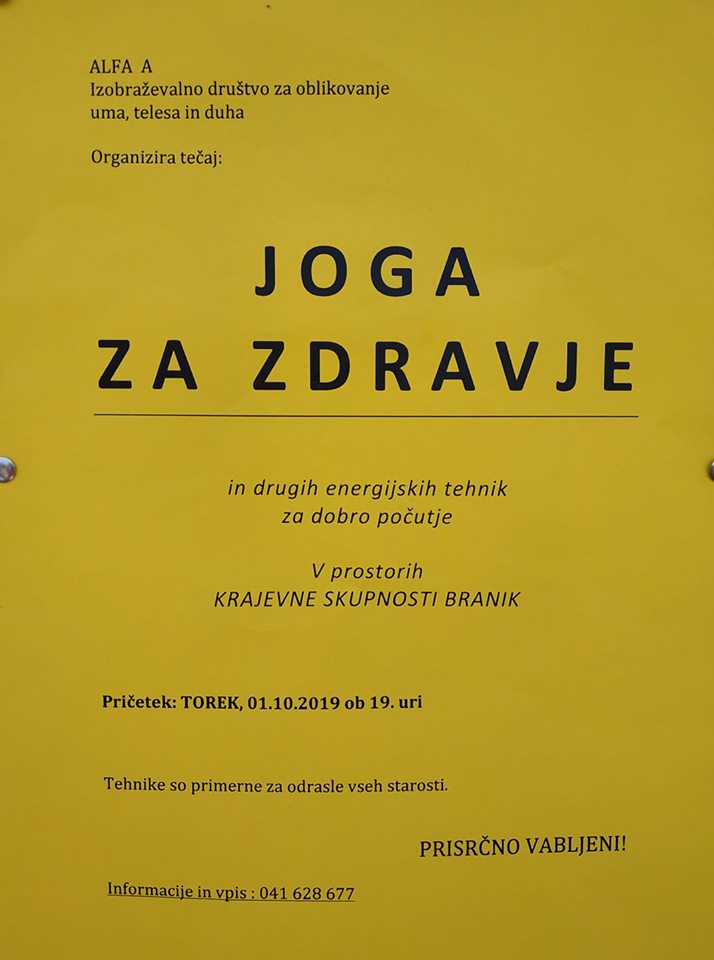 Vabljeni na tečaj joge, ki prične v torek 1.10. ob 19. uri v prostorih krajevne skupnosti.